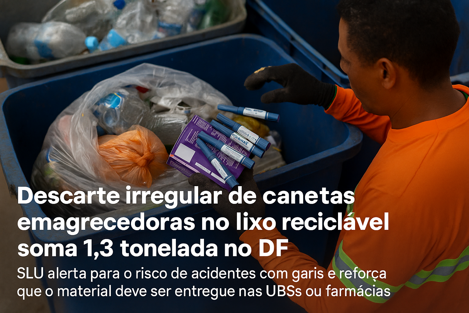 Entre 2024 e 2025, o Serviço de Limpeza Urbana (SLU) do Distrito Federal recolheu cerca de 1,3 tonelada de canetas emagrecedoras descartadas de forma irregular no lixo reciclável. O volume equivale a aproximadamente 36 mil unidades, segundo levantamento do órgão. O descarte incorreto desse tipo de resíduo preocupa as autoridades por representar risco direto à saúde dos garis e ao meio ambiente.